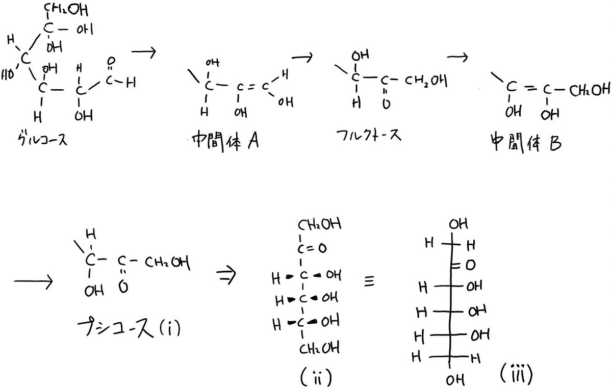 同じようにして、フルクトースから中間体Bを考え、そこから生成される構造式を考えます。問コの2行目「プシコースのカルボニル基の炭素原子の位置番号はフルクトースと同じ」ということを考慮すると、プシコースの構造式が書けると思います。