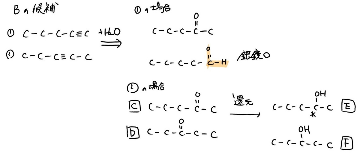 水を付加させると図1のようにカルボニル化合物ができます。化合物C・Dはいずれも銀鏡反応を示さないことからケトンのみができる方がBとなります。C・Dを還元すると、それぞれ不斉炭素原子をもつ化合物Eともたない化合物Fができるので、それぞれ構造式が定まります。